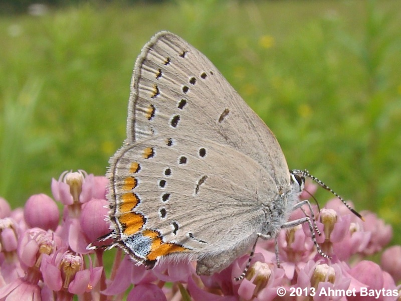Identification: Very small—size of thumbnail, but just a bit larger than most of NJ's other Satyrium hairstreaks. Almost never seen with wings open. Below: FW and HW light gray, each with a band of small, white-ringed dark spots. Single blue spot within orange band on hindwing has obvious orange cap.