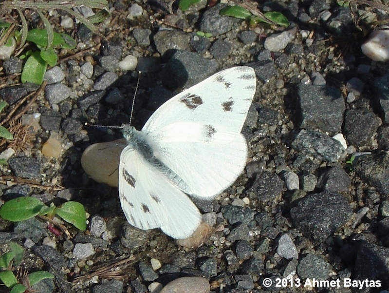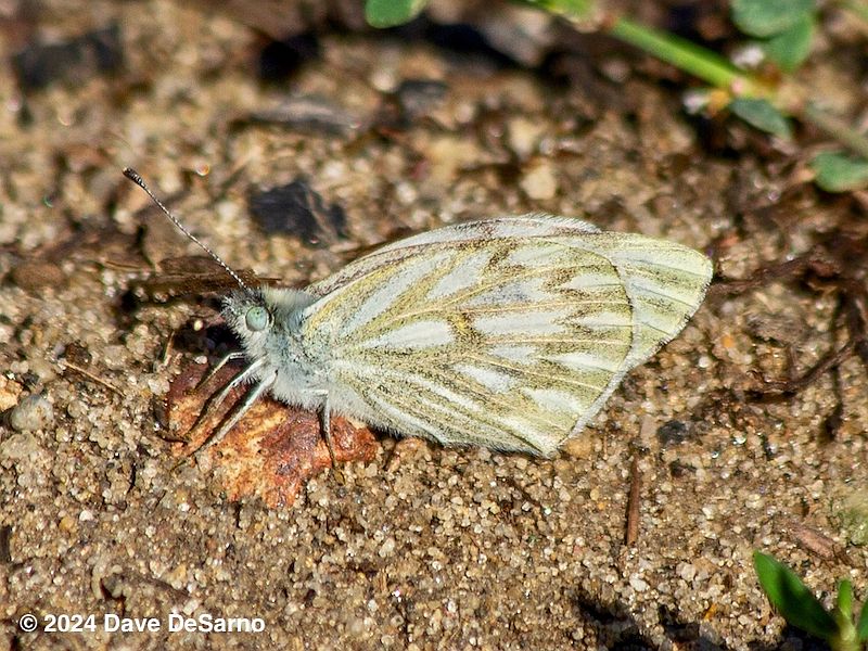 Identification: Small—1.6" (similar to the very familiar Cabbage White). Unlike Cabbage White, occasionally seen with wings open. Above: Male FW mostly white with black and gray spots; HW almost entirely white. Females are much more heavily marked, with extensive black markings on FW and gray markings on HW. Below: Male FW white with several black spots; HW almost entirely white. Female with gray markings on FW below, and extensive, angular, yellow-brown to yellow-green markings on HW below.