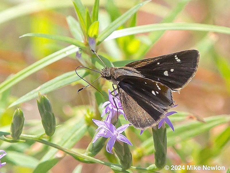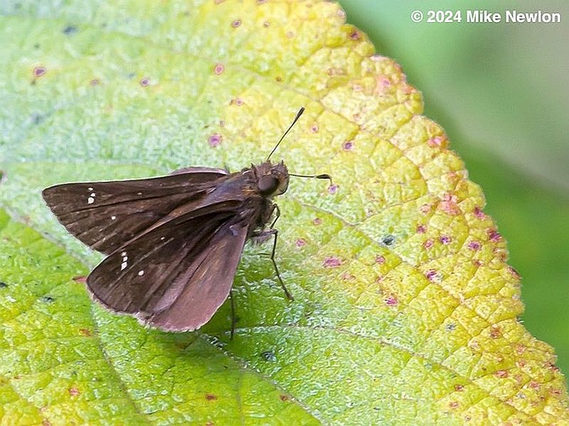 Identification: Very small—FW 0.7". Sexes similar below. Above: FW dark brown with 3 connected "bracelet" spots near the apex and 1 or 2 separated white spots in central area. The central spots are more conspicuous in the female, with the innermost one larger. HW unmarked dark brown. Below: Both wings dark brown, with pale, violet-tinged "frosting" along margins, and a separate area of frosting across the inner HW. The dark band between the frosted areas may be more conspicuous than the frosting itself when the butterfly is worn. Similar skippers: Most resembles a female Zabulon Skipper but lacks that species' white line along outer curve of HW.