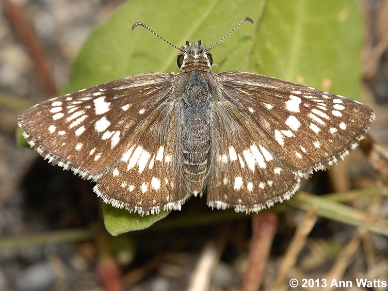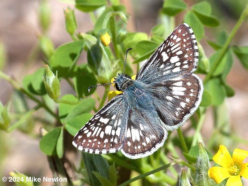 Identification: Very small—1.1". Above: FW and HW black, with many, mostly rectangular, white spots that give a checkered appearance; spots form a white band across mid-HW. Female, with smaller white spots, appears noticeably darker than male. Male (as well as some fresh females) has bluish, hairlike scales on body and inner wings. Wing fringes are white with blackish checks. Below: FW and HW creamy-white with dark markings, including 2 jagged-edged bands across HW.