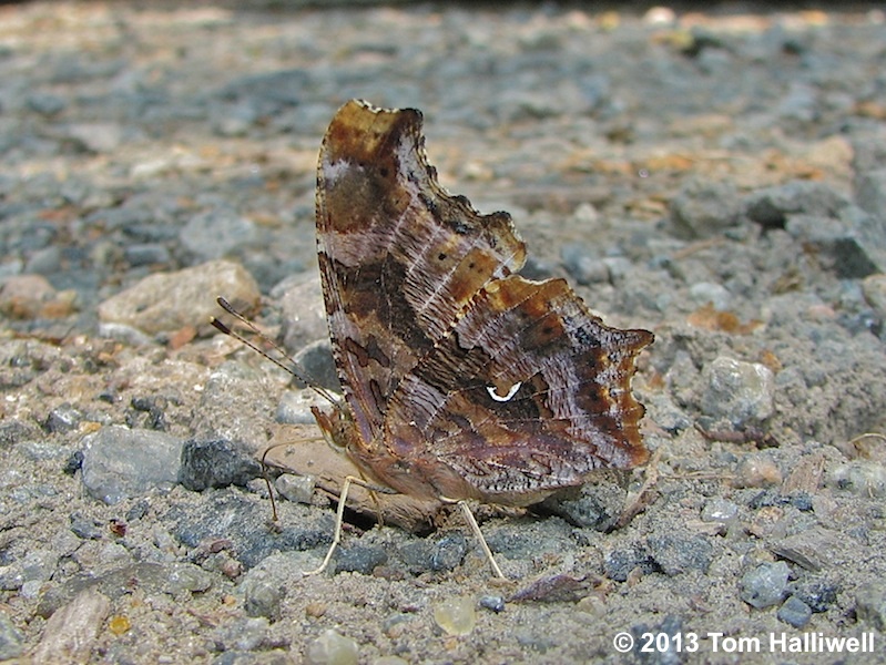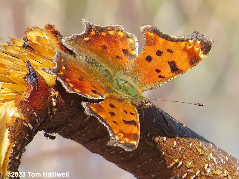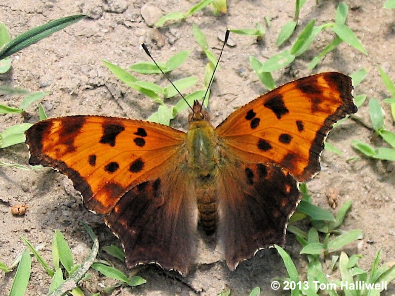 Identification: Small—1.9” (slightly smaller than Question Mark [QM]). Wing margins distinctly irregular (often more scalloped than QM), with FW hooked at tip and HW tailed. Above (light form): FW and HW bright orange with many black markings, including a line of 3 round spots on FW (NOT capped by a horizontal dash, as in QM); HW with submarginal pale spots and a central dark spot. Above (dark form): FW same as light form, but HW mostly blackish, with some orange near the base. Spotting variably obscured. Below: FW and HW range from rather plain gray-brown (sometimes with pale violet overtones) to distinctly mottled in shades of dark and light brown. HW with silvery mark in center consisting of a short, curved line ("comma"), lacking the separate dot seen in QM.