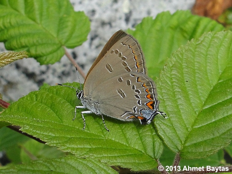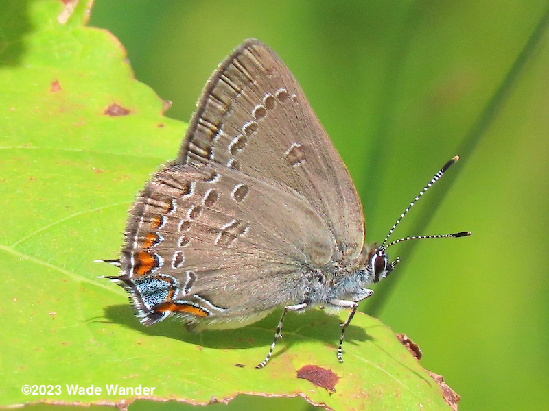Identification: Very small—size of thumbnail. Almost never seen with wings open. Sexes similar. Below: FW and HW light grayish-brown, with postmedian markings consisting of clearly-defined, white-ringed, dark ovals rather than the white-edged, darkish bands of many other Satyrium hairstreaks, such as Banded. Several orange spots along HW margin, interrupted by a large blue spot with a tiny, hard-to-see orange cap. Similar hairstreaks: Wing markings on Banded and Hickory are bands rather than distinct ovals.