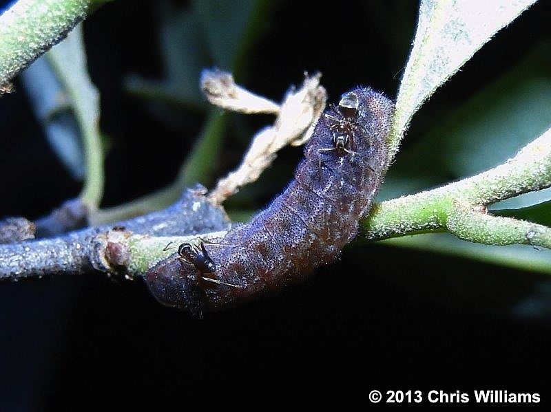 Comments: This species is dependent on ants—Formica integra, and possibly other species in this genus. The ants protect the caterpillars, “escorting” them from an ant-built shelter at or near the base of a host plant, up into the branches where the caterpillars feed on leaves at night, and then back to the shelter. What’s in this for the ants, you ask? Apparently, irresistibly sweet secretions from the caterpillars.
