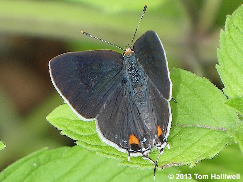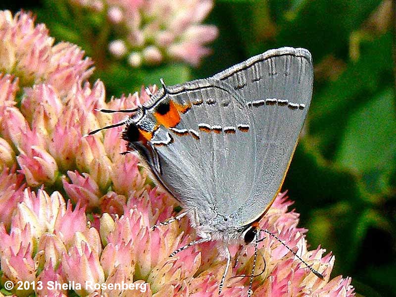 Identification: Small—size of thumbnail. Above: FW and HW unmarked dark gray-brown, except HW with large orange and black spot near tails. Top of head is orange, and male's abdomen is orange, female's is gray. This is the only species of hairstreak in NJ that one is likely to see perched with open wings. Below: FW and HW clean, light pearl-gray crossed by narrow black postmedian lines bordered with white and orange. Large, squarish orange spot on hindwing includes large black spot at wing margin. Similar hairstreaks: See discussion under White M Hairstreak.
