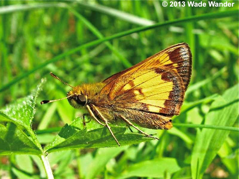 Identification: Very small—FW ≥0.6". Above: Male FW mainly orange-yellow with wide, dark trailing border, dark veins, and dark, S-shaped mark attached to dark tip. FW of normal female is similar to male's but with brown toward base of wing. In both sexes HW has orange center crossed by dark veins and surrounded by dark borders. Pocahontas-form female is dark brown above with a pale FW "bracelet" and additional small pale spots, including an isolated spot along the leading edge. Below: Normal-form sexes similar: HW with brown base and brown trailing border enclosing a large, unspotted yellow patch. Pocohontas female is purplish-brown with "ghost" of normal yellow patch on HW. Similar skippers: Zabulon male has narrower dark borders on FW above and neither wing has dark veins crossing the orange; below, yellow patch on HW has several reddish-brown spots. Zabulon female above has large, glassy spots in FW and lacks isolated spot; below, HW is rich, mottled brown with a white outline along leading edge.