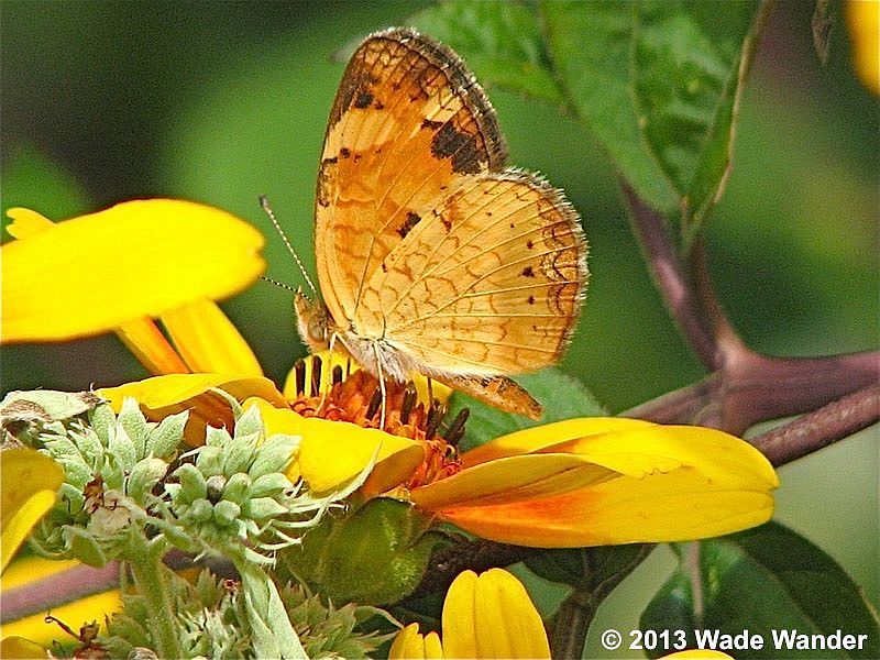 Identification: Very small—1.3". Above: FW and HW orange with black netlike pattern (more pronounced in the female), dark margins, and a row of black submarginal dots on the HW. Band across mid-FW may be yellowish in the female. Below: FW and HW orange-yellow with dark patches. HW mostly pale orange with a variable amount of narrow dark veining. Markings variable (see photos). Intensity of markings in both wings varies with season, sex, and individual. Both sexes have a pearly, crescent-shaped mark usually set into a darkish patch along the HW margin. Other: Extreme tips of antennal clubs are black in the male (often with a small pale or orange mark inward of the tip), orange in the female. Females generally larger than males.