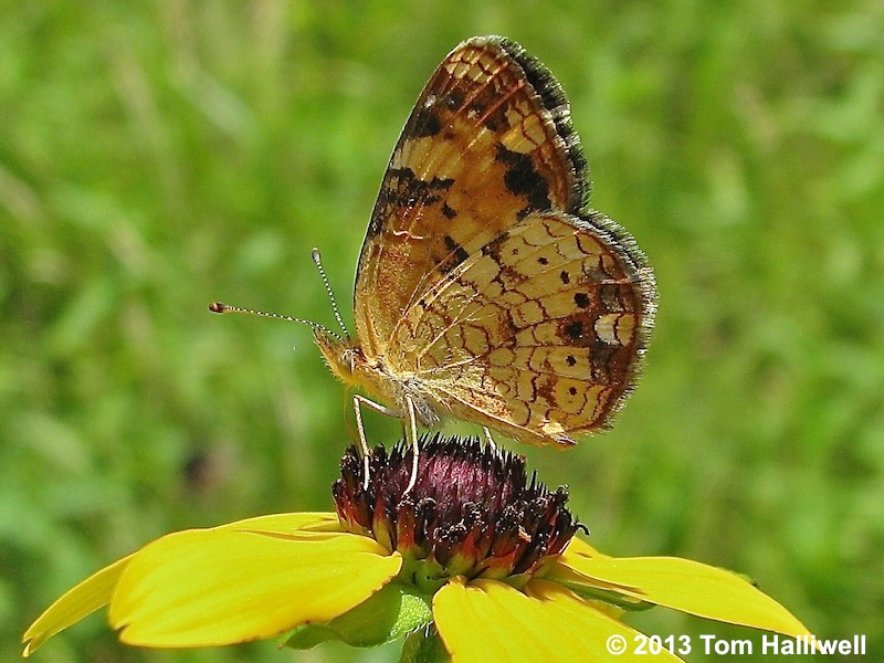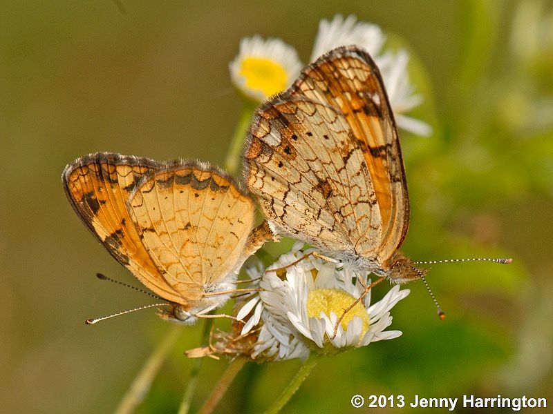 Comments: Shortly after emergence, Pearl Crescents sometimes congregate in large numbers near puddles. Within a day or two, however, most disperse into fields to nectar and mate.