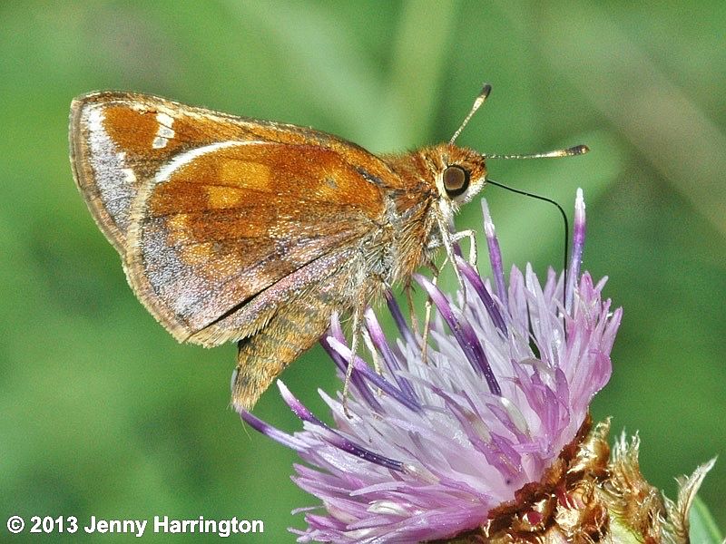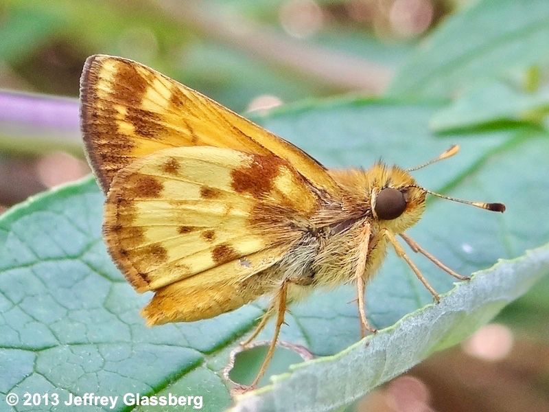 Identification: Very small—FW ≥0.6". Above: Male FW mainly orange-yellow with dark trailing border, and a squarish dark mark just touching dark border near FW tip. HW has orange central patch surrounded by dark borders; orange patch usually extends as a tiny point toward outer HW angle. Female FW is dark brown above a row of flashy white/glassy spots and a pale "bracelet." Below: Male HW with reddish-brown base and trailing border enclosing a large yellow patch with several reddish-brown spots, and a small yellow spot near the shoulder. Female HW and FW rich, dark, reddish-brown with frosting on outer margins and a white outline along leading edge of HW. Similar skippers: Hobomok male and normal female have wider dark borders on FW above and dark veins crossing the orange on both wings. Male has an S-shaped mark near FW tip and female has brown base to FW. Below, yellow patch on Hobomok HW lacks reddish-brown spots. Pocahontas female above lacks large, glassy spots in FW and white edge to HW. Clouded Skipper resembles Zabulon female but lacks white line along outer curve of HW and occurs only in the far South Jersey counties. Peck's Skipper is smaller and lacks rusty-brown spots in yellow patch on HW below.