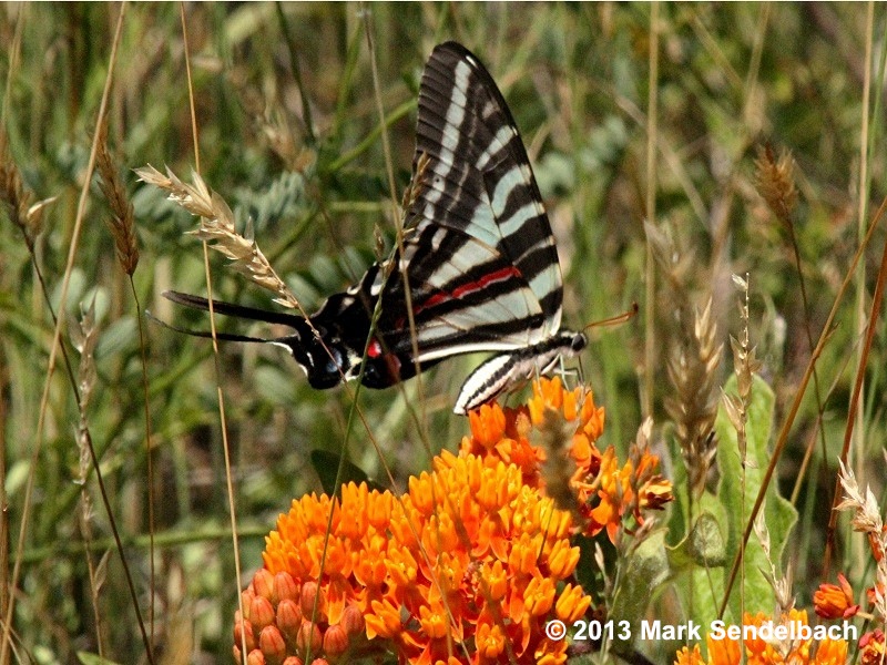 Identification: Large—3.1" (smaller than Eastern Tiger Swallowtail). Above: FW and HW striking near-white with black stripes. Below: Black and near-white stripes set off with a vivid red stripe on HW. The longest tails of any NJ swallowtail.