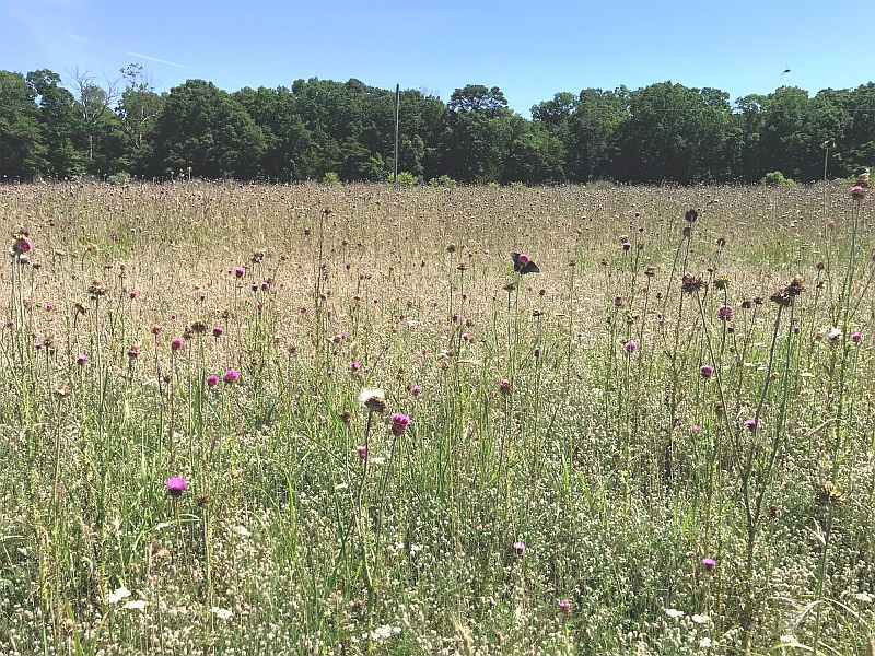 Maintained/Marked trails: Yes. Estell Manor Park has an extensive network of trails that can be viewed on this map. Many of the trails here were formerly railroad beds and are flat and make for easy walking. The trails at Lenape Farms are a dirt road and a grassy trail through pine-oak-holly woods with Atlantic White Cedar in some areas. Depending on how it is managed year to year, sometimes there are fields planted with wildflowers, especially the first field on the right after the entrance gate.